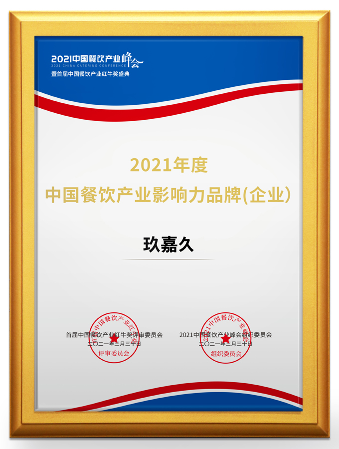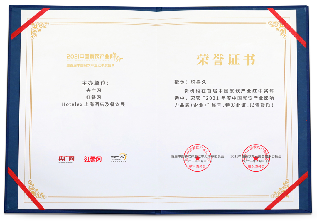 自2020年12月開始,在海選階段,“中國餐飲產業(yè)紅牛獎”的評審委員會從餐飲產業(yè)鏈和眾多提報的企業(yè)中,挑選了超過2500家符合評審規(guī)則的餐飲以及相關領域的企業(yè)。而后又歷經了專家組的初審,以及具有一定爭議的復審。紅牛獎的評選歷時4個月之后,首屆“中國餐飲產業(yè)紅牛獎”的最終名單得到確認。在此次頒獎盛典中,玖嘉久榮獲「2021年度中國餐飲產業(yè)影響力品牌(企業(yè))」。
