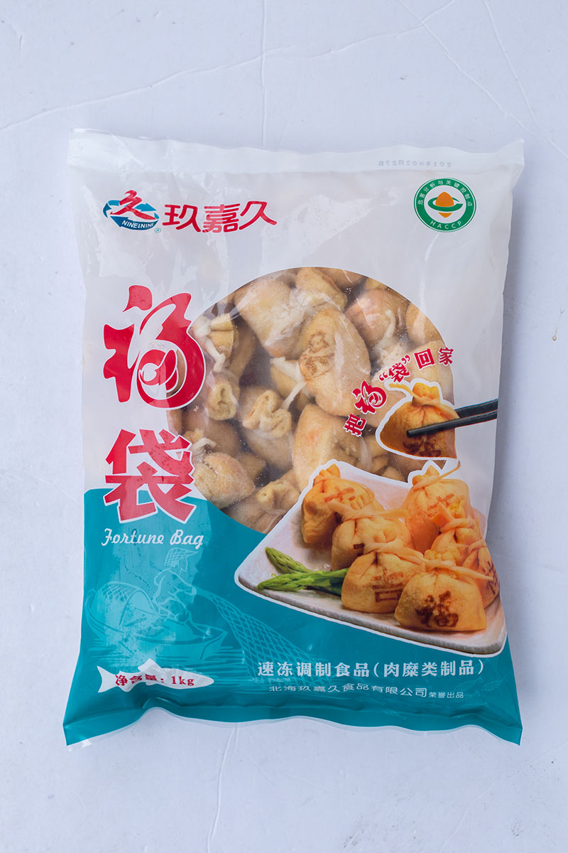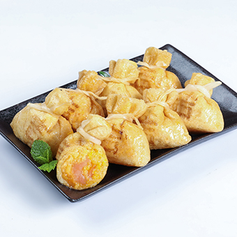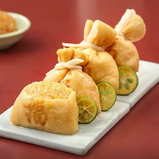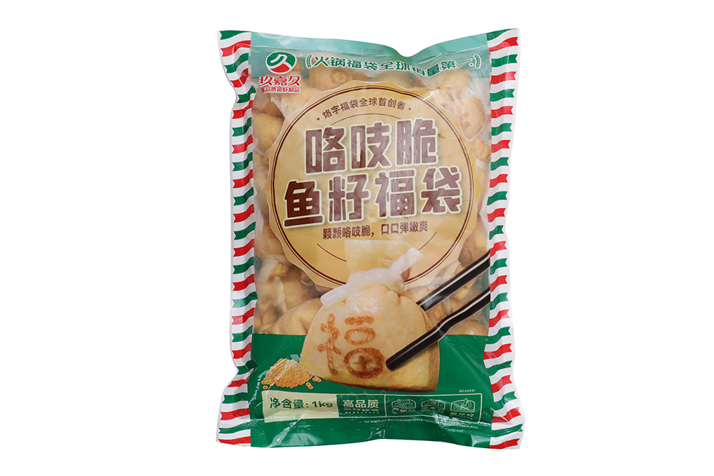 產(chǎn)品特性:優(yōu)質(zhì)豆皮包裹金黃飽滿魚籽,意頭十足,形狀如袋子故稱福袋,口感滑嫩彈牙,鮮香濃郁!