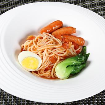 脆皮腸煎熟,番茄切丁煮成醬汁,放入面煮熟,碼上脆皮腸、雞蛋和上海青即可。
