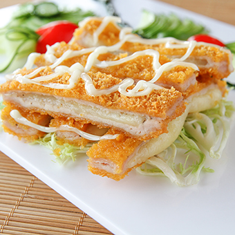 做法:海豬肉切薄片,用廚房紙擦干水分,切一片芝士放在兩片海豬肉中間,用力壓出空氣。雙面裹上面包糠,熱鍋下油,炸5分鐘即可。